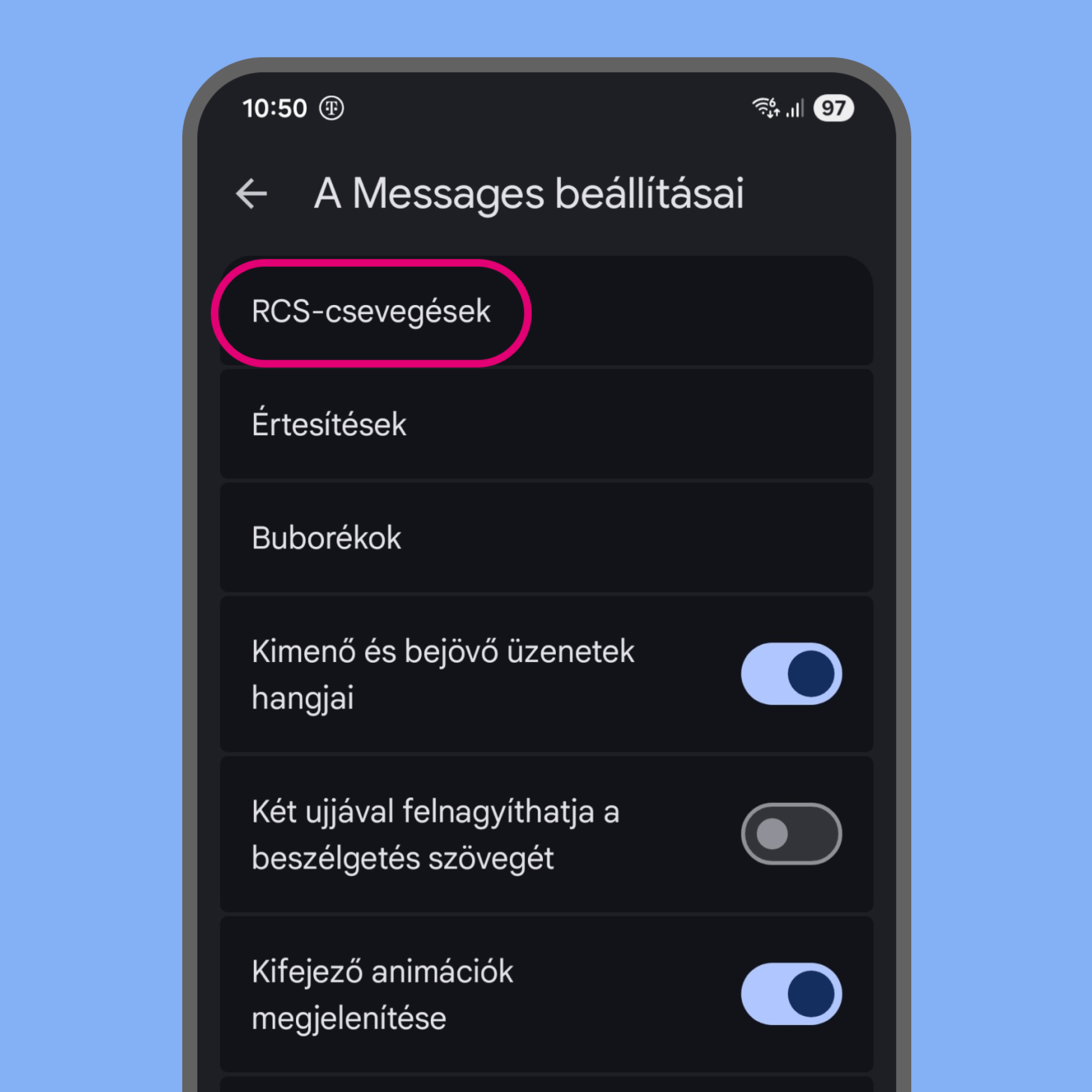 A Messages-beállítások menüben keresd az RCS-csevegések menüt.