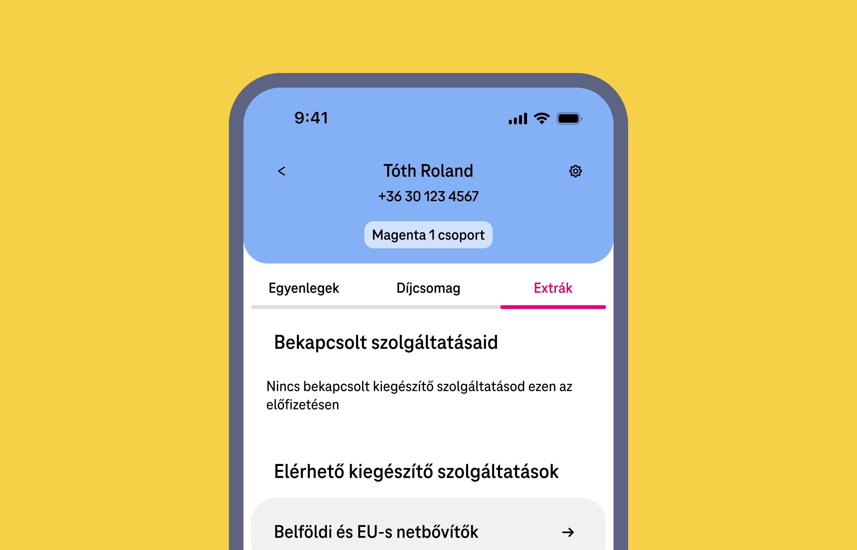 Az Extrák fülön extra netet vehetsz belföldi és külföldi használatra egyaránt, díjcsomagtól függően streaming szolgáltatásokat is aktiválhatsz.