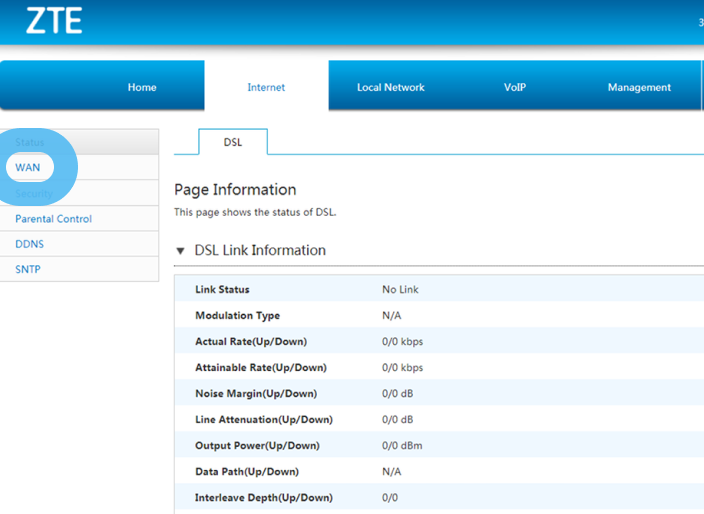 A megjelenő oldal bal oldalán kattints az „WAN” linkre. Itt állíthatod be az internet csatlakozást.