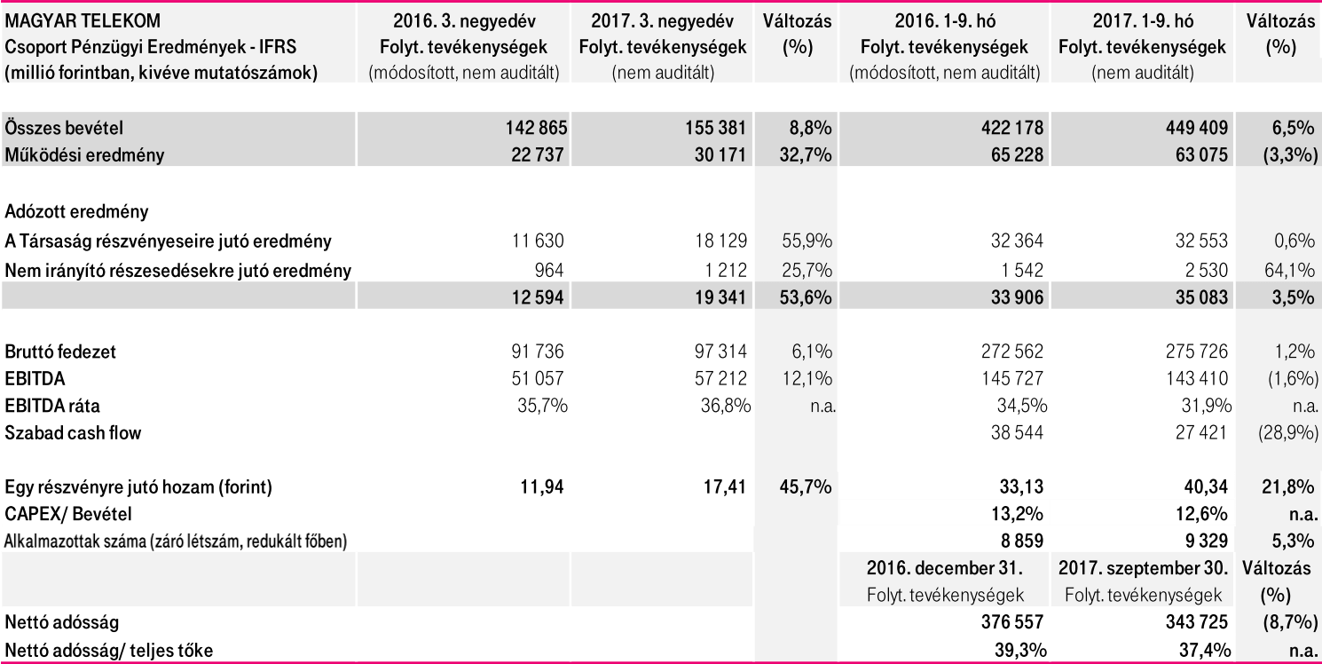 A Magyar Telekom (Reuters: MTEL.BU és Bloomberg: MTELEKOM HB), Magyarország vezető távközlési szolgáltatója ma közzétette 2017. harmadik negyedévre és első kilenc hónapjára vonatkozó Nemzetközi Pénzügyi Jelentési Szabványok (IFRS) szerinti konszolidált pénzügyi eredményeit.
