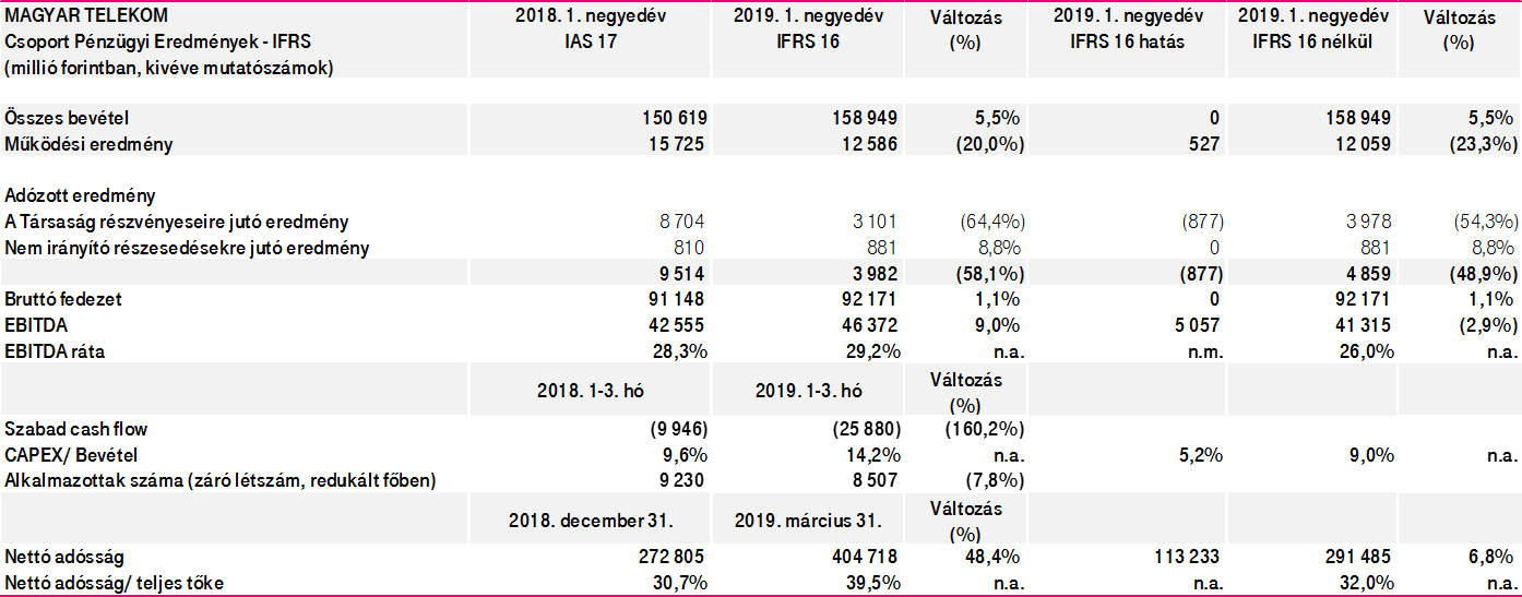 “Örömmel erősíthetem meg, hogy a Magyar Telekom megőrizte 2018 évi lendületét és mind bevételek mind az EBITDA terén növekedést ért el 2019 első negyedévében. Bevételeink 5,5%-kal 158,9 milliárd forintra emelkedtek, az adatszolgáltatások vezetékes és mobil szegmensben mutatott jó szereplése, valamint az eszközértékesítése további növelése révén. A 9%-os EBITDA növekedés az IFRS16 bevezetésének tudható be, ami nélkül enyhe csökkenés jelentkezett a Magyarországon kifizetett végkielégítések következtében. A szabad cash-flow soron a szokásosnál jelentősebb első negyedévi csökkenést regisztráltunk, de a 2019-ben tervezett ingatlanértékesítéseknek köszönhetően az idei évi célkitűzésünket elérhetőnek tartjuk.