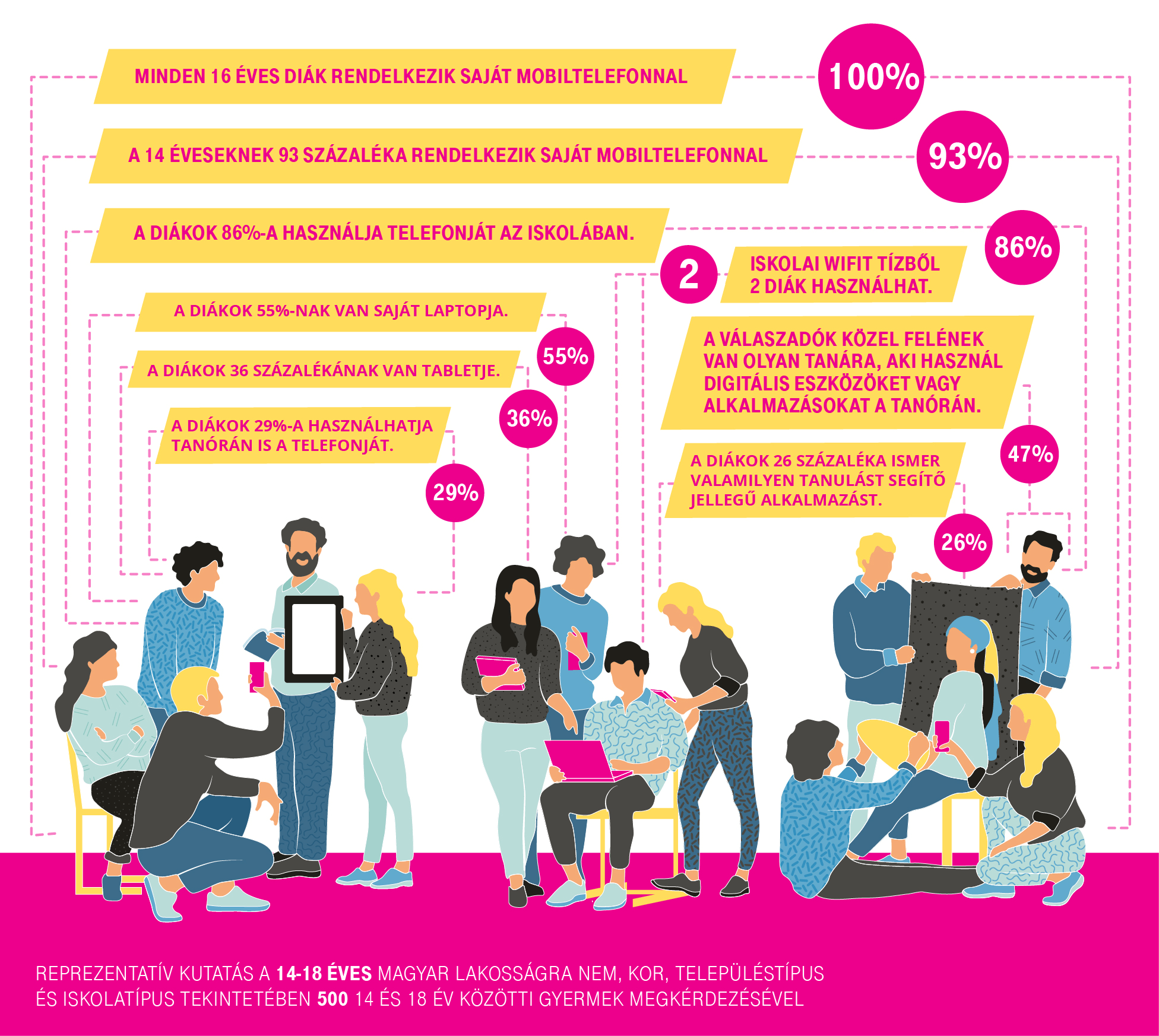 Szinte minden 16 éves diák rendelkezik saját mobiltelefonnal, közel harmaduk pedig használja a mobilt még tanórán is - derült ki a felmérésből. A középiskolai korosztályban nincs hiány digitális eszközökből: a diákok több mint felének van saját laptopja, 36 százalékának tabletje, mobiltelefonnal pedig már a 14 éveseknek is 93 százaléka rendelkezik.A válaszadók közel felének van olyan tanára, aki élve a MOST lehetőségeivel, digitális megoldásokkal színesíti a tanórát. A diákok persze azt szeretnék, ha ez az arány 100 százalékos lenne. A digitális tanár legfőbb ismérve szerintük, hogy különböző mobil alkalmazásokat használ az órán, elektronikusan adja fel a házit és érdeklődik a legújabb technológiai trendek iránt. A megkérdezett fiatalok 26 százaléka ismer valamilyen tanulást segítő alkalmazást, körükben legnépszerűbbek a nyelvtanulást megkönnyítő applikációk. A diákok úgy látják, hogy elsősorban a természettudományos tantárgyakat, például a matematika vagy fizika órákat lehetne a leginkább feldobni digitális módon.